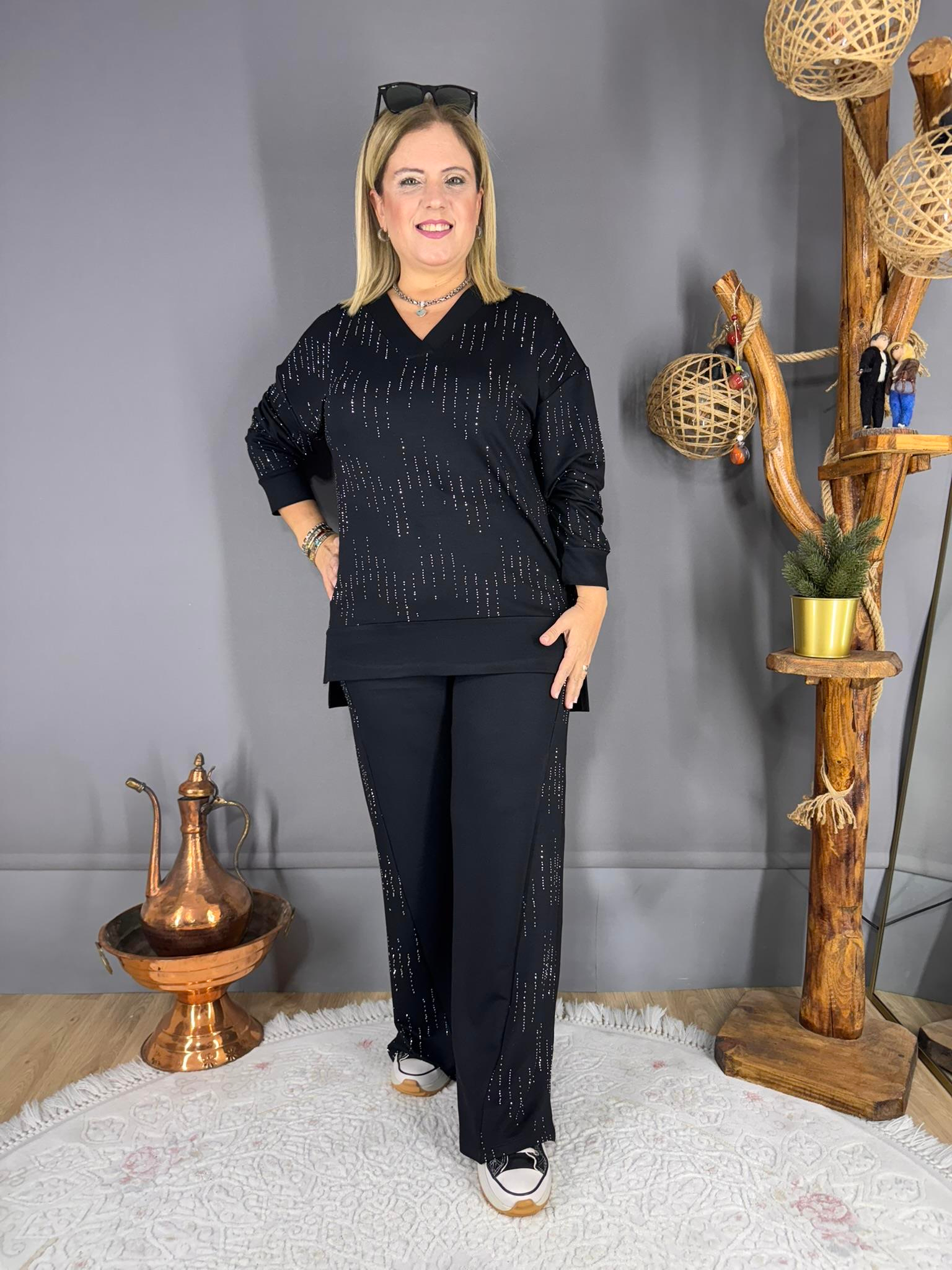 EYZ703 SİYAH V YAKA ÖN KOPLE TAŞLI EŞOFMAN TAKIMTA