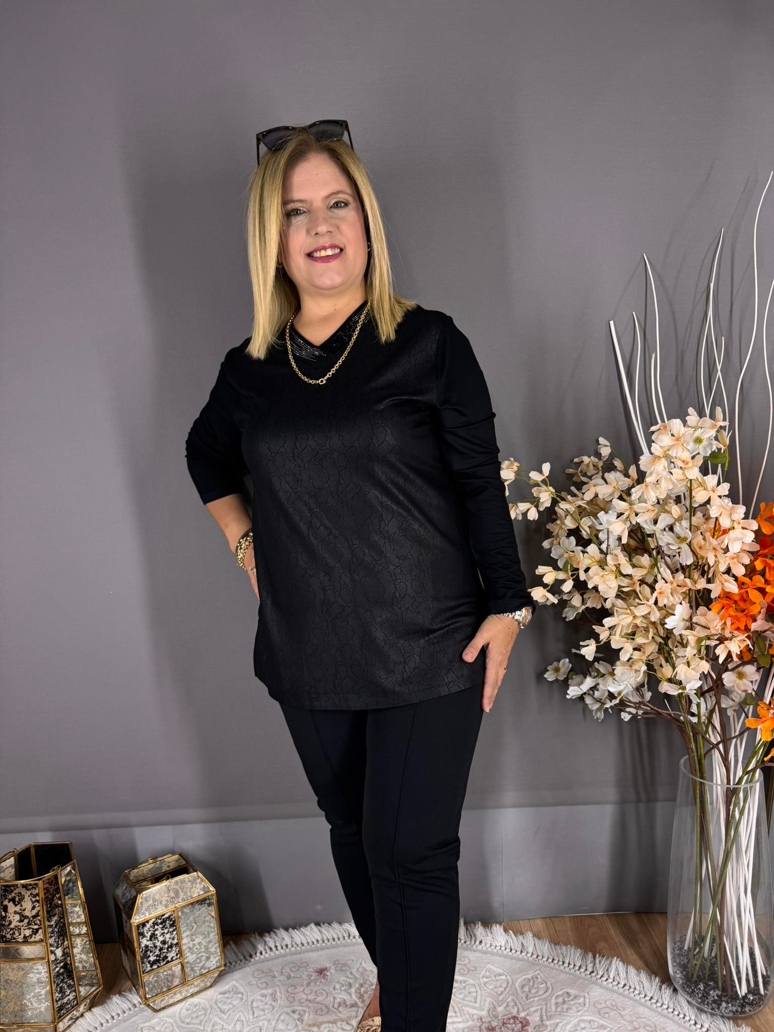 EYZ706 SİYAH V YAKA TAŞLI ÖN KOMPLE DERİLİ BLUZ