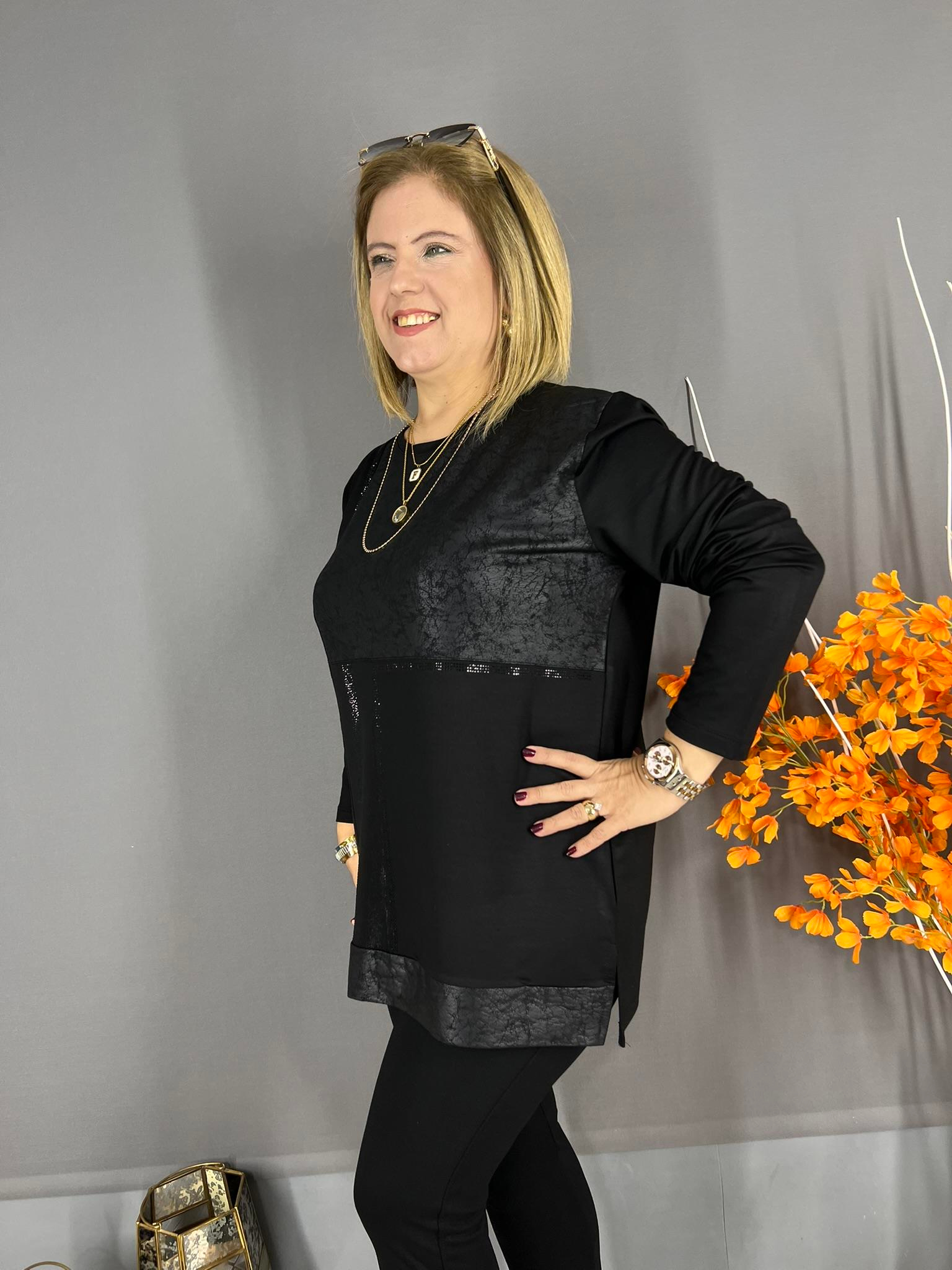 EYZ38 SİYAH DERİ DETAYLI İNCE TAŞ İŞLEMELİ BLUZ