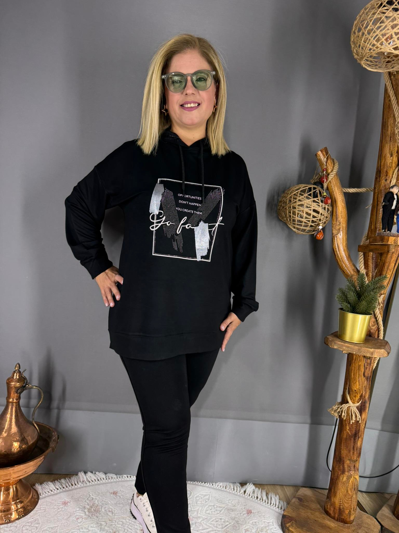 EYZ684 SİYAH KAPUŞONLU TAŞ BASKILI SWEAT